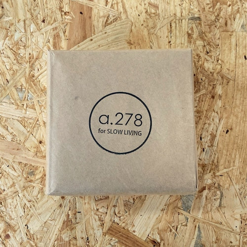 クラフト紙に、a.278のロゴスタンプを押したラッピングです。