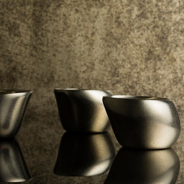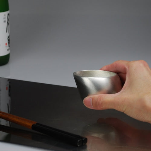 トラベルチョコは飲み口の位置を変えることで変化するお酒の味わいを楽しむことができるユニークな錫の酒器です。