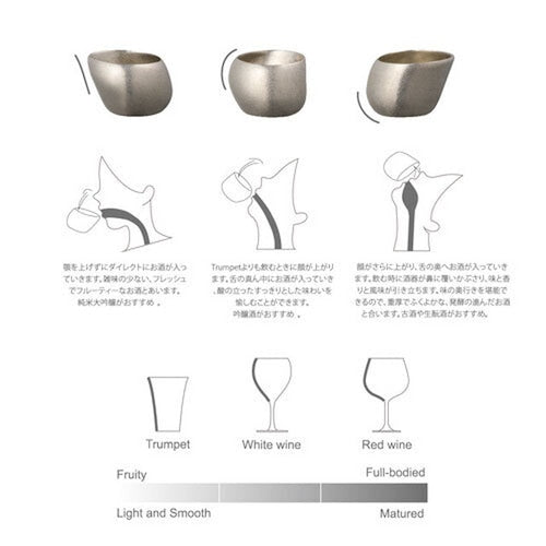 同じ飲み物でも飲み口を移動することで味わいに変化が表れ、日本酒以外にもワイン、冷たいコーヒーやお茶等の香り・風味をお楽しみ頂けます。
