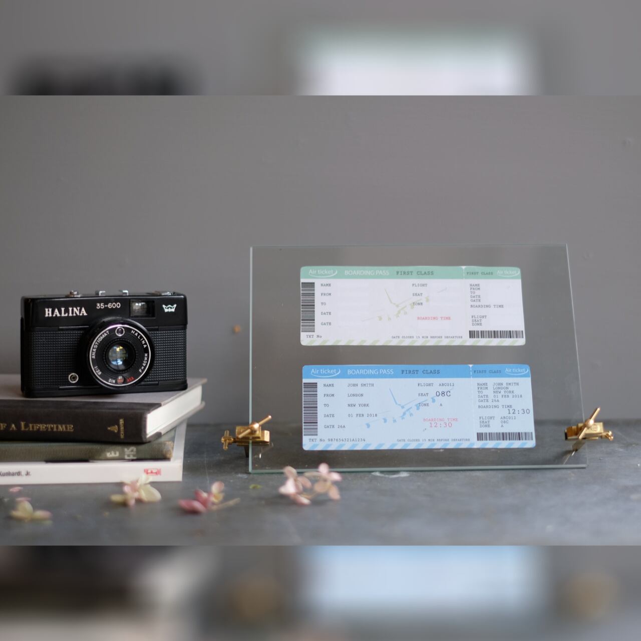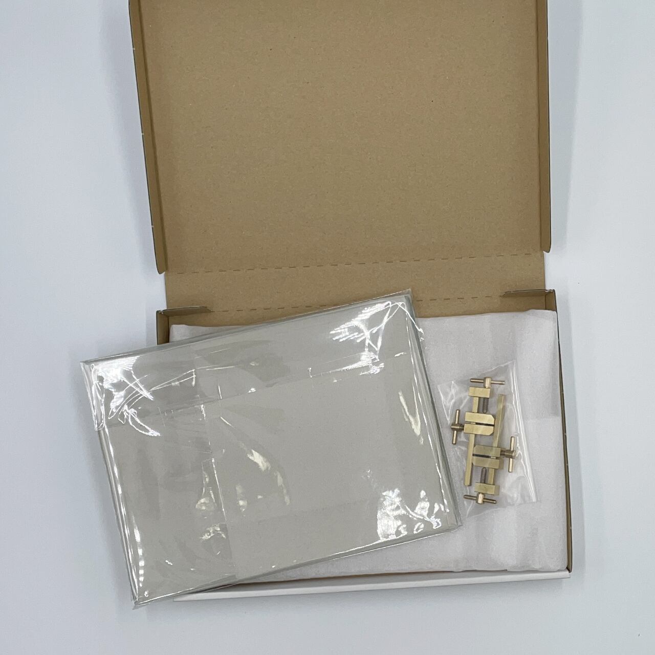 真鍮のハタガネで2枚のガラスをはさみ、取り付け位置により角度を調整することのできる卓上フォトフレームです。