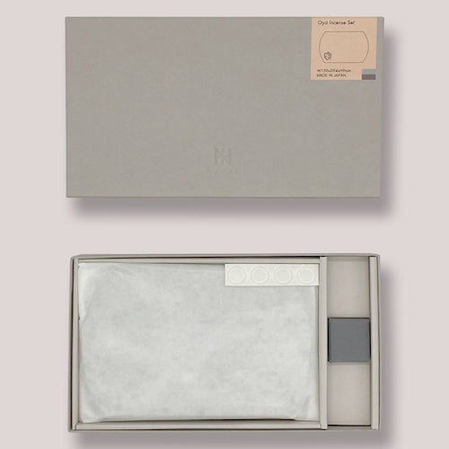 品は耐火性・耐熱性に優れ1000度以上の熱に耐えることから、かまど、石窯、焼却炉にも使われている大谷石の香皿大屋香皿と、経年変化により色合いが変化する素材であるブロンズの精密鋳造でつくられた香立ポリ香