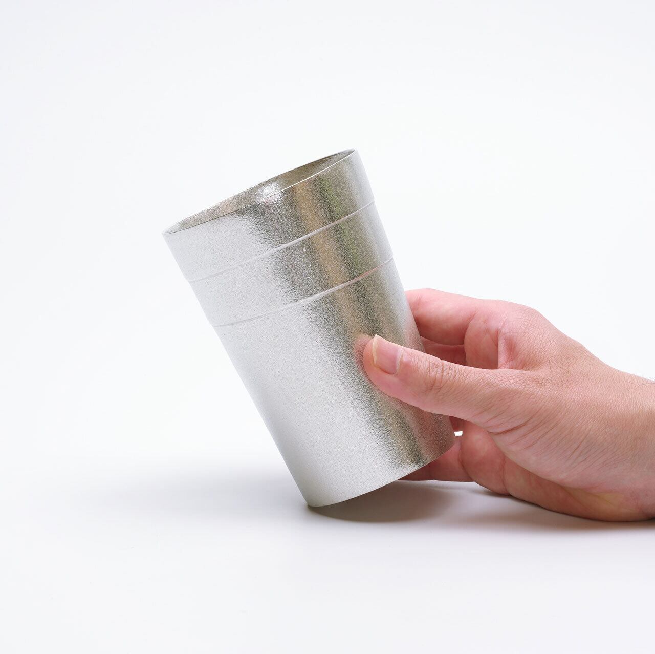 富山県、伝統工芸『高岡銅器』の街、高岡市に本社を置くものづくり総合メーカーである株式会社ナガエがリリースするインテリアライフスタイル雑貨ブランド「銀雅堂(ぎんがどう)」の錫の酒器シリーズ「SHIZUNAMI 静波」のタンブラー(USパイント)です。