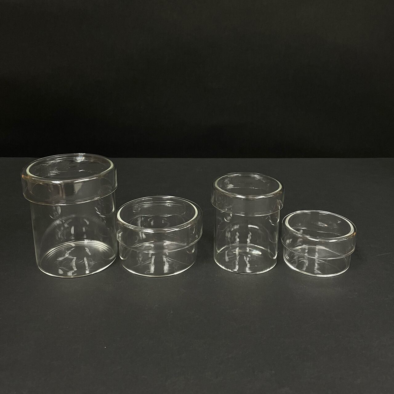 バーナーワークにより、チューブ状のホウケイ酸ガラス(耐熱ガラス)から作られる蓋つきポット。蓋はシャーレ形状なのでトレイとしても使えます。