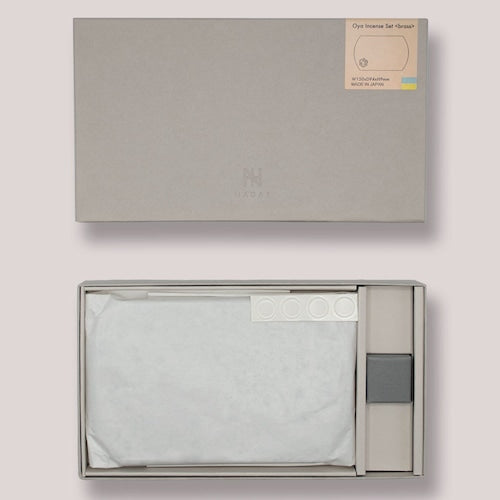 品は耐火性・耐熱性に優れ1000度以上の熱に耐えることから、かまど、石窯、焼却炉にも使われている大谷石の香皿大屋香皿と、経年変化により色合いが変化する素材である真鍮のダイキャスト鋳造でつくられた香立ポリ香