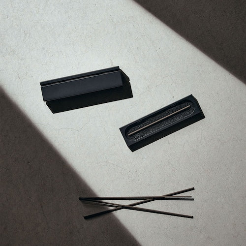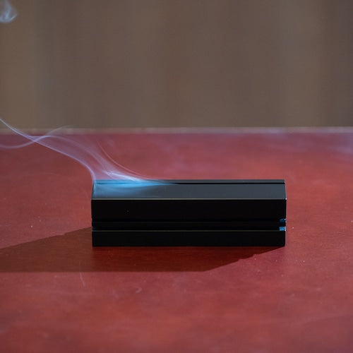 efu(エフー)は線香タイプのお香を横倒しで置いて焚く香炉です。スリットから少しづつ立ち昇る香煙で、香りがやさしく広がり、香煙が揺らぐ様子を視覚的にたのしむこともできます。efu black(エフーブラック)は素材は真鍮、ブラックコーティングを施しています。重厚感のあるマットな質感の香炉と有機的な香煙とのコントラストが印象的です。