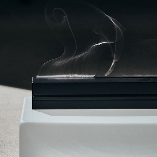 直線的なスリットから立ち昇る香煙は、揺らいだり、その場にとどまったり、本体の形状とは対照的に、有機的で偶発的な表情を見せてくれます。efu(エフー)の名前には、心地よさを感じさせると言われる「1/fゆらぎ」のFrequency(周波数)の「f」、Fluctuation(ゆらぎ)の「f」、Flow(香煙の流れ)の「f」の意味が込められています。