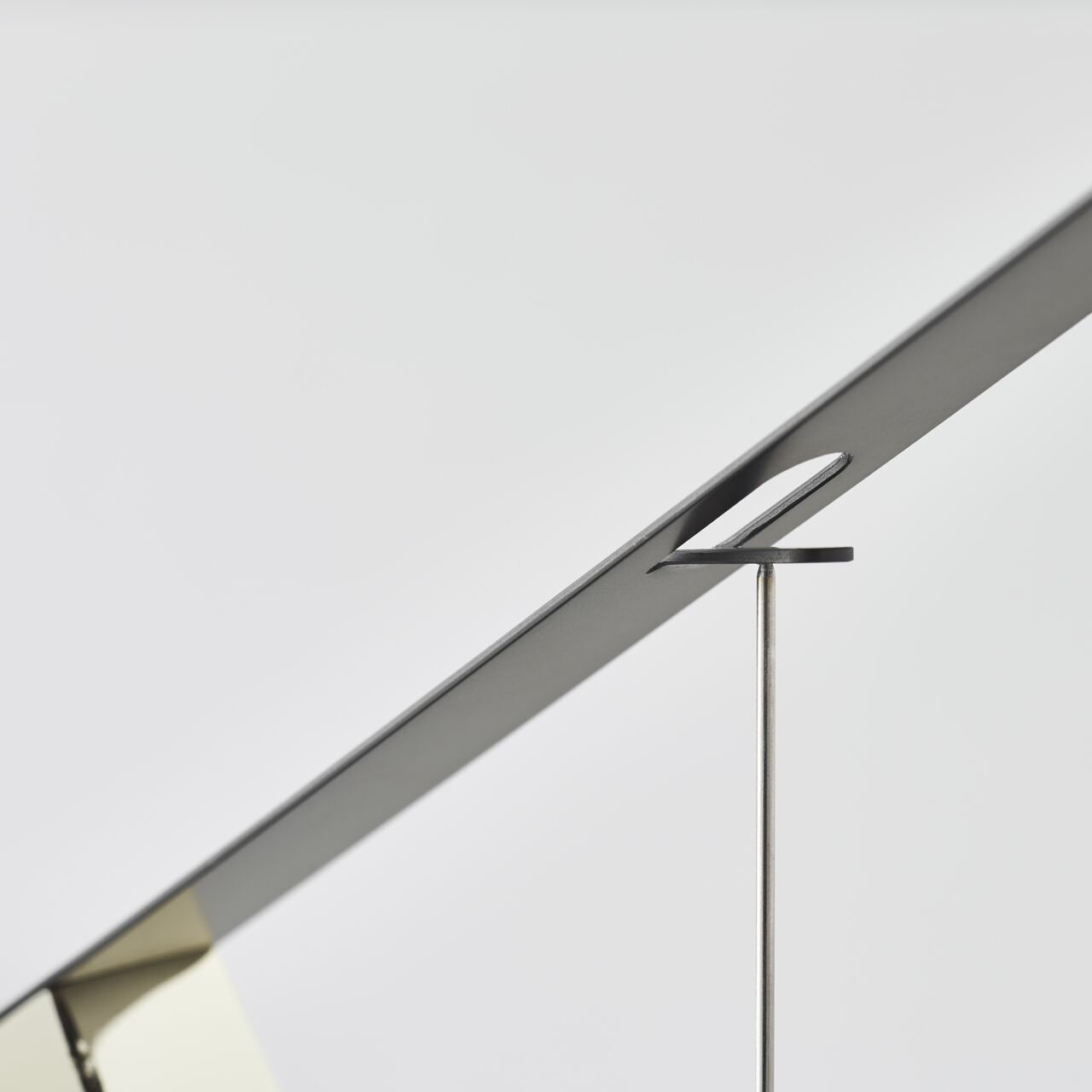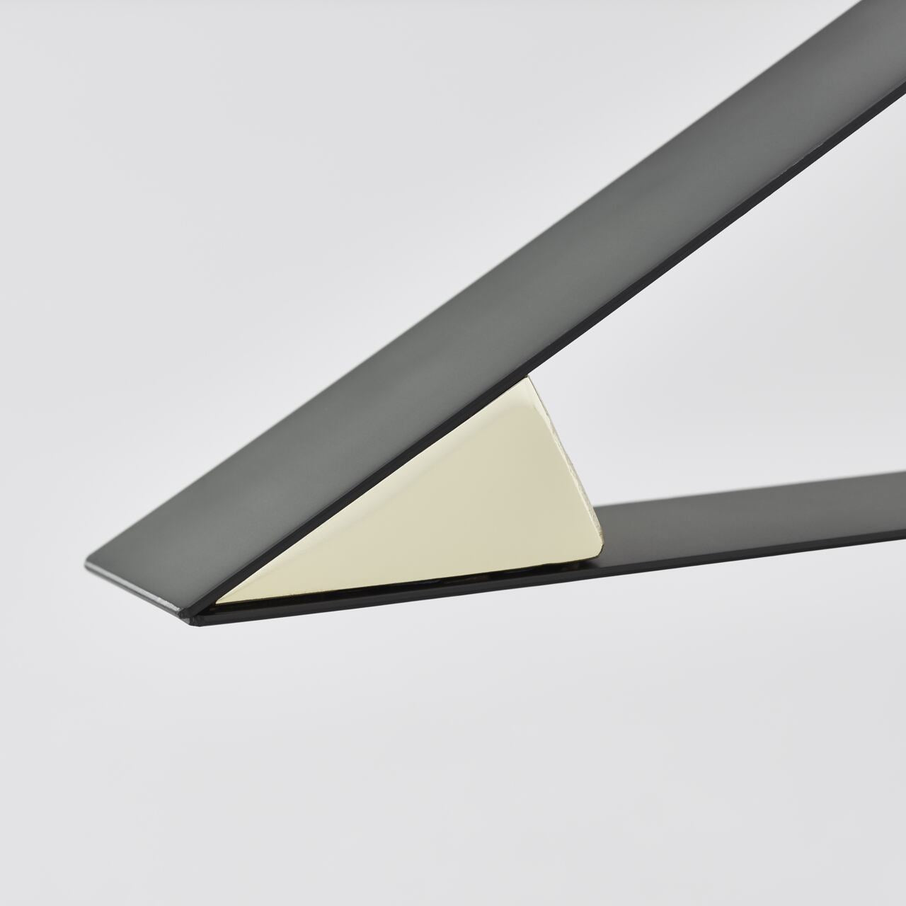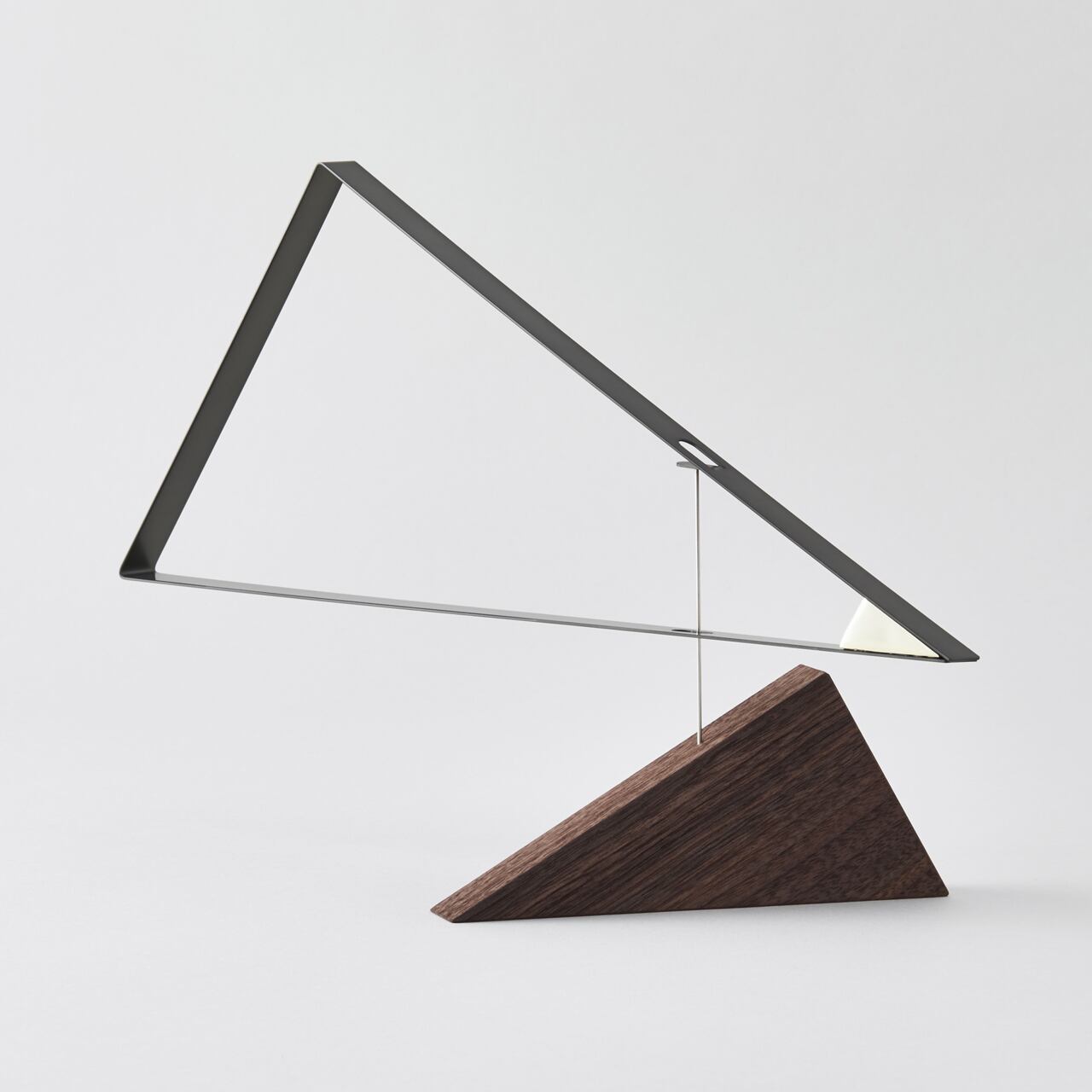 小さなスチールのブロック(塊)は全体のバランスを保ち、ウォルナット製のウッドベースがフレームとブロックの両方を支えています。パーツの三角形の比率は全て同じ。