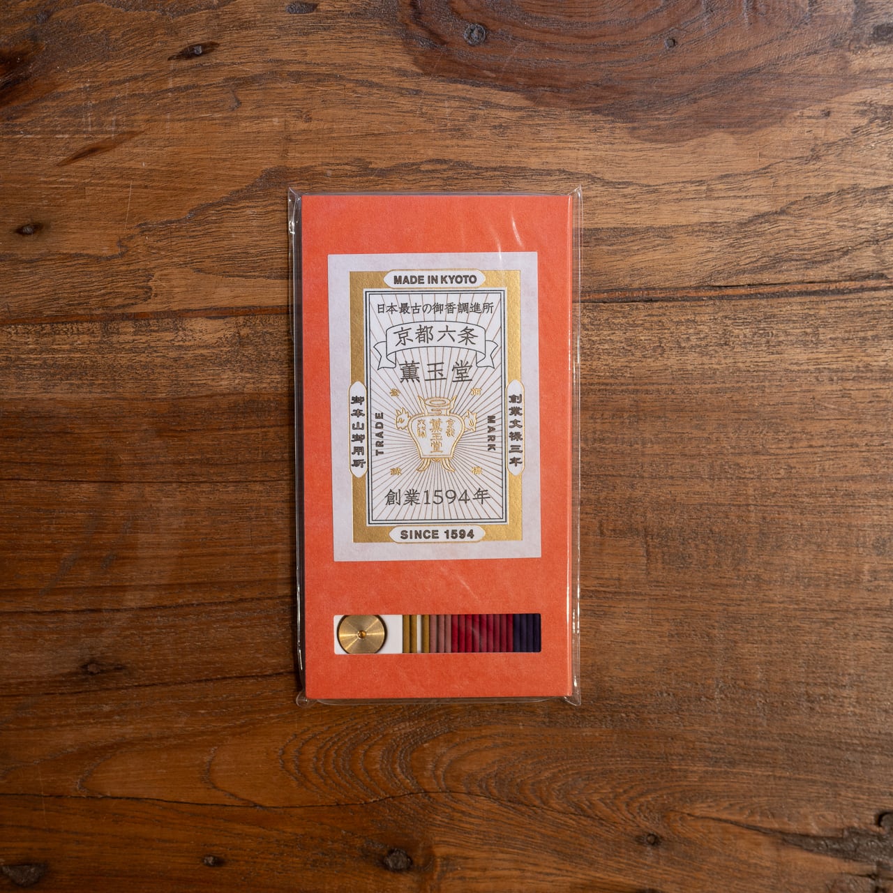 薫玉堂のお香6種類(各3本)をアソートにしたお香セットで、真鍮製のシンプルなお香立ても付属しています。(写真のトレイは付属しません)